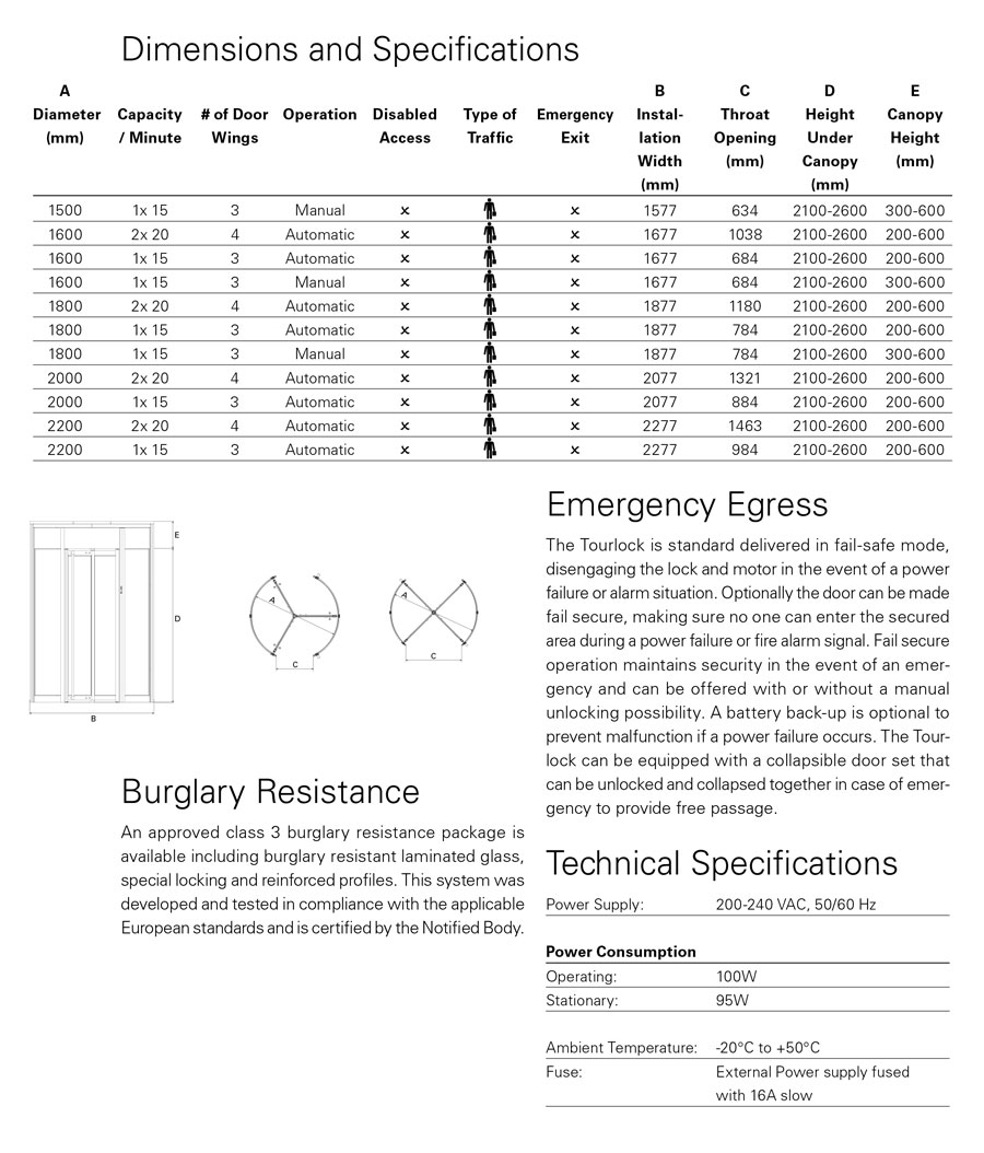 The Tourlock 120 is an automated three wing security revolving door. This is a slightly less sophisticated version of the Tourlock that can be integrated with a sensor system, contact mats or a weight system. As the door only has three segments, simultaneous bi-directional traffic is not possible. However users entering and leaving the building can authorise themselves at the same time, the second authorisation will be remembered and rotation will start as soon as the first passage has been completed.